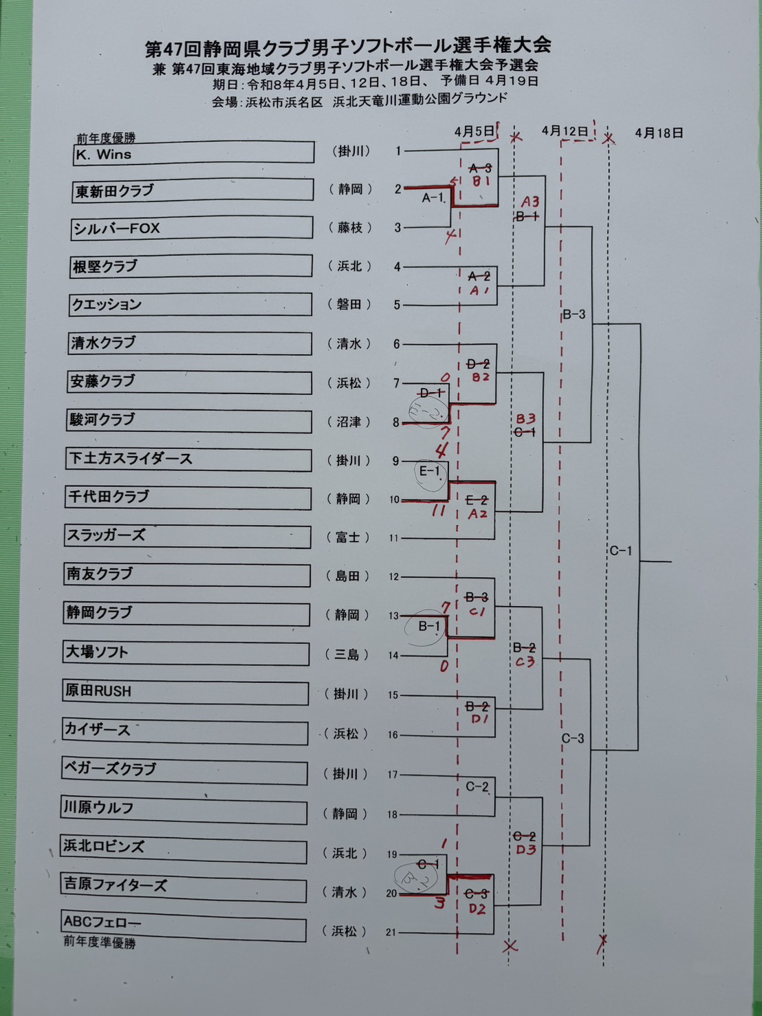 第47回静岡県クラブ男子ソフトボール選手権大会(東海 ⇒ 全日本) ●開催予定日:2026/4/5(日) 12(日) 18(土) 予19(日) ●開催地:浜北天竜川運動公園(浜北) 備考: 【優勝】清水クラブ(清水)と 【準優勝】静岡クラブ(静岡)は 第47回東海地域クラブ男子ソフトボール選手権大会 2026/5/9(土)・10(日) 三重県 四日市市 に出場予定 大会要項 組合せ表 その他詳細 結 果 広報レポート 過去の成績 試合結果詳細(記録4号)